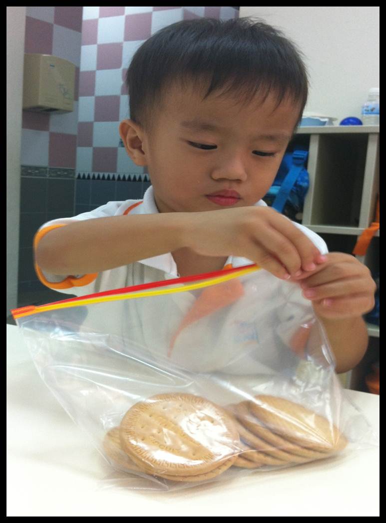 Anson and Micheal carefully took out the biscuit and placed them into a ziplock bag as they count the number of biscuit that goes into the bag.